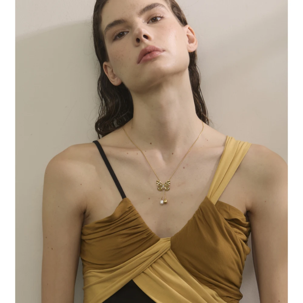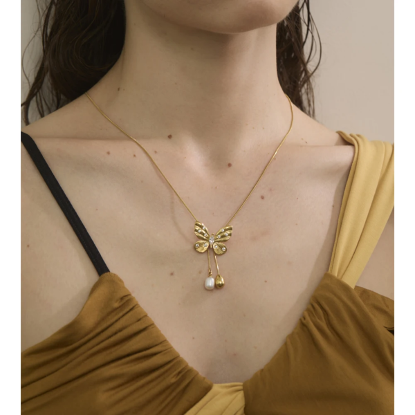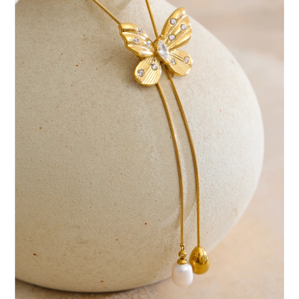قلادة بتصميم فراشة مطعمة بالزاركون واللؤلؤ ستانلس ستيل مقاوم للخدش، طلاء ذهب 18ثابت، لايتأثر بالماء ولايسبب التحسس.