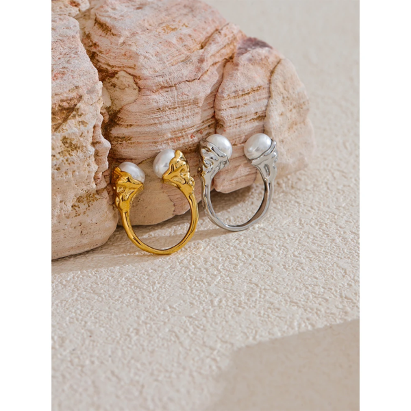 خاتم بأضافة اللؤلؤ ستانلس ستيل مقاوم للخدش، طلاء ذهب 18ثابت، لايتأثر بالماء ولايسبب التحسس.