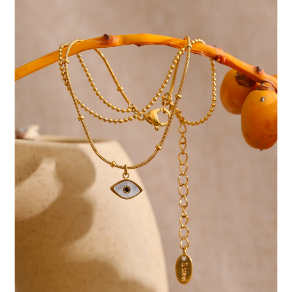 سوار بتصميم طبقتين بإضافة خرزة عين ستانلس ستيل مقاوم للخدش، طلاء ذهب 18ثابت، لايتأثر بالماء ولايسبب التحسس.