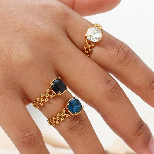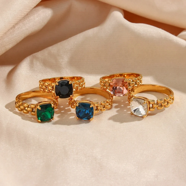 خاتم بتصميم فص زاركون ملون ستانلس ستيل مقاوم للخدش، طلاء ذهب 18ثابت، لايتأثر بالماء ولايسبب التحسس.