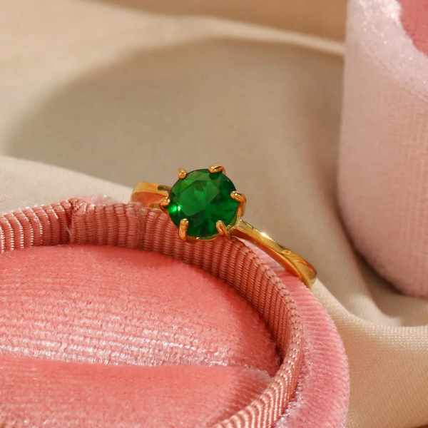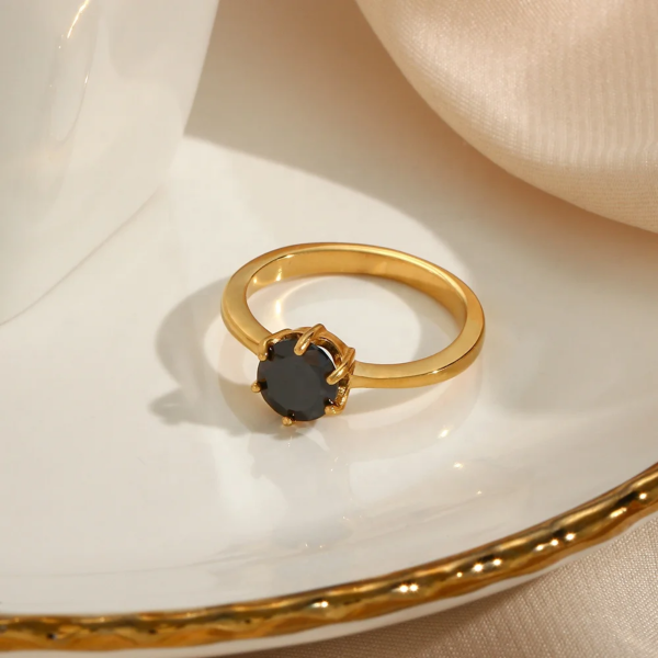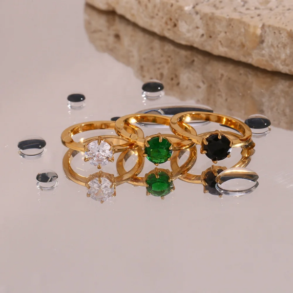 خاتم رفيع بفص زاركون ملون ستانلس ستيل مقاوم للخدش، طلاء ذهب 18ثابت، لايتأثر بالماء ولايسبب التحسس.
