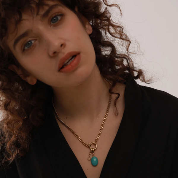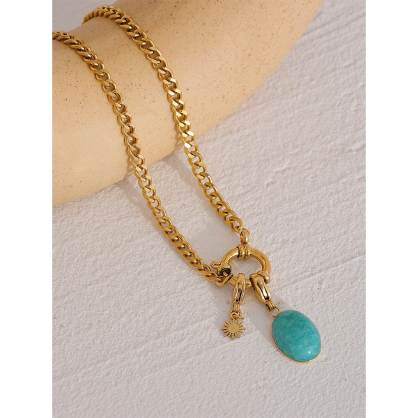 قلادة بتصميم بيظوي من الحجر الطبيعي الفيروزي ستانلس ستيل مقاوم للخدش، طلاء ذهب 18ثابت، لايتأثر بالماء ولايسبب التحسس.