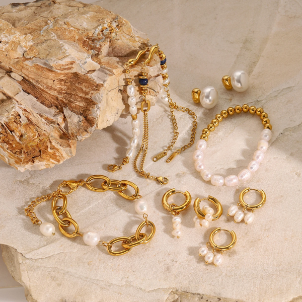 سوار بتصميم كرات مطعم بالؤلؤ، ستانلس ستيل مقاوم للخدش، طلاء ذهب 18ثابت، لايتأثر بالماء ولايسبب التحسس.