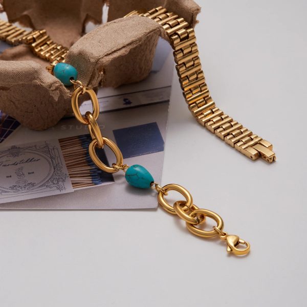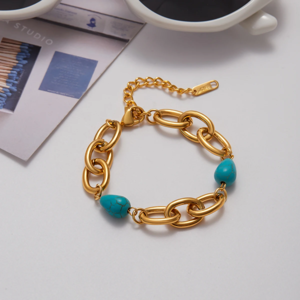 سوار بتصميم حلقات مطعم بحجر فيروزي ،ستانلس ستيل مقاوم للخدش، طلاء ذهب 18ثابت، لايتأثر بالماء ولايسبب التحسس.
