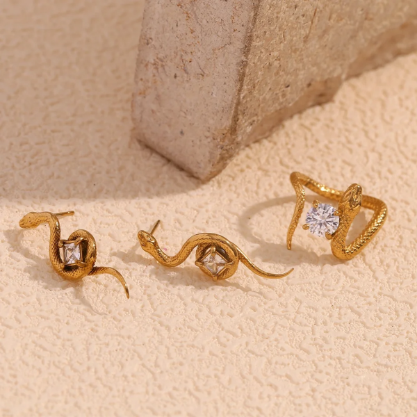 خاتم بتصميم أفعى مطعمة بالزاركون،ستانلس ستيل مقاوم للخدش، طلاء ذهب 18ثابت، لايتأثر بالماء ولايسبب التحسس.