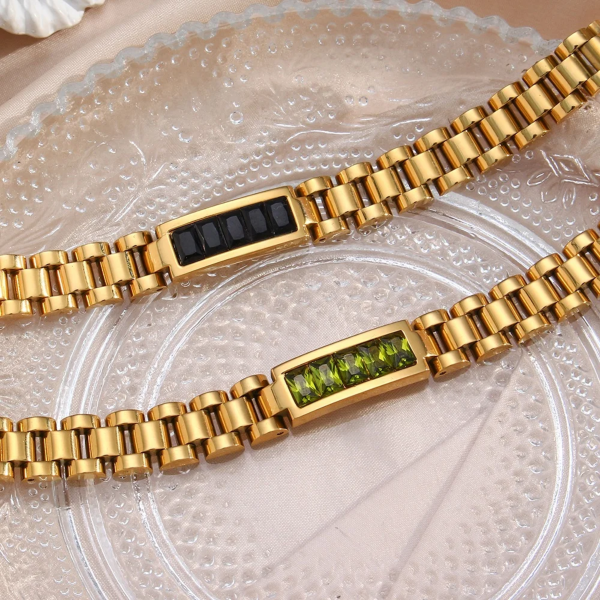 سوار ساعة مرصع بالزاركون الملون ،ستانلس ستيل مقاوم للخدش، طلاء ذهب 18ثابت، لايتأثر بالماء ولايسبب التحسس.