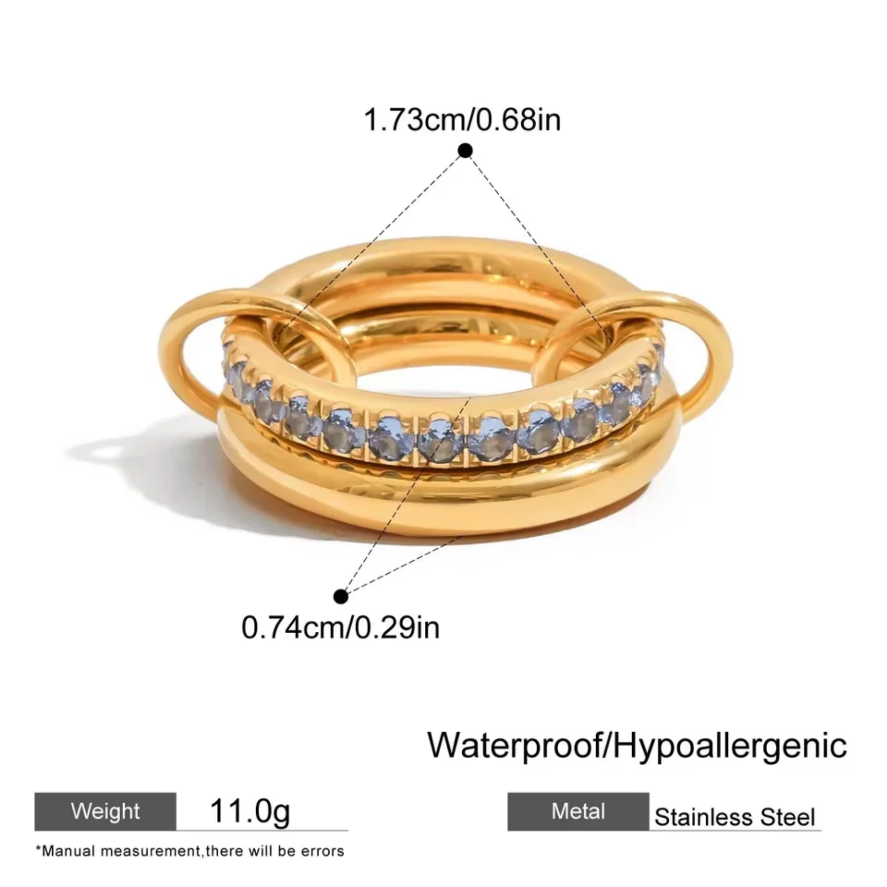 خاتم بطبقتين مرصع بالزاركون الملون ،ستانلس ستيل مقاوم للخدش، طلاء ذهب 18ثابت، لايتأثر بالماء ولايسبب التحسس