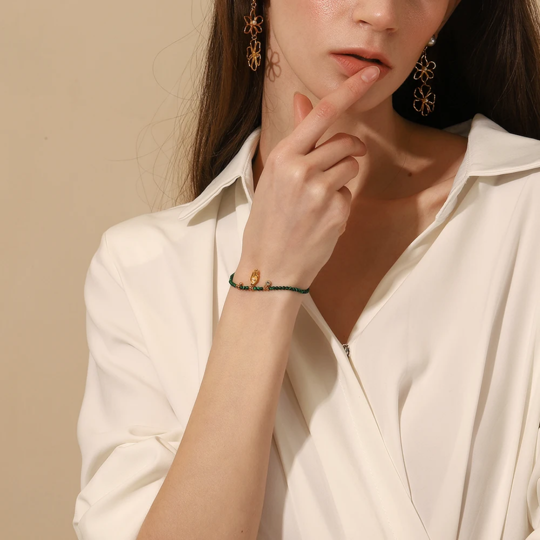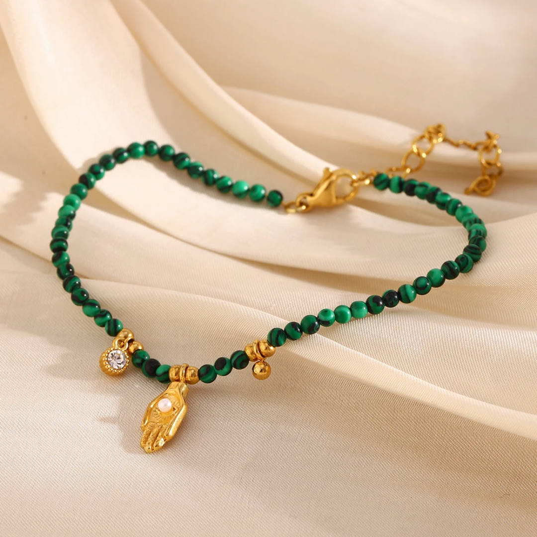 سوار أحجار كريمة مطعم بمدالية كف عين الحسد،ستانلس ستيل مقاوم للخدش، طلاء ذهب 18ثابت، لايتأثر بالماء ولايسبب التحسس.