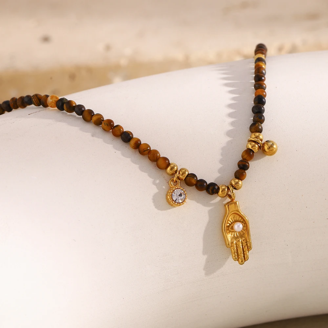 سوار أحجار كريمة مطعم بمدالية كف عين الحسد،ستانلس ستيل مقاوم للخدش، طلاء ذهب 18ثابت، لايتأثر بالماء ولايسبب التحسس.