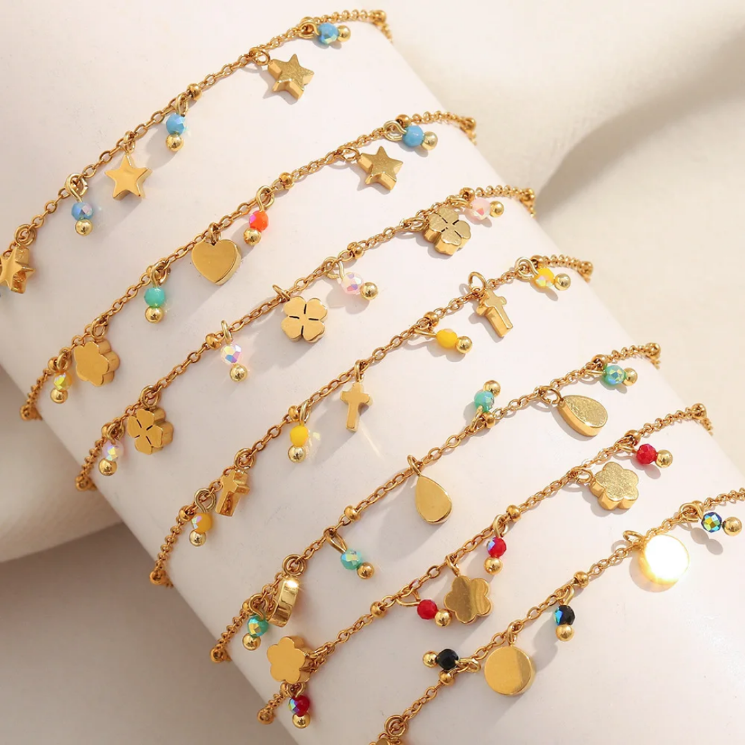 سوار فرفشة أحجار ناعمة بإضافات قلب ،نجمة ،وردة ستانلس ستيل مقاوم للخدش، طلاء ذهب 18ثابت، لايتأثر بالماء ولايسبب التحسس.