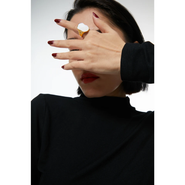 خاتم بشكل غير منتظم مطعم بالصدف الأبيض،ستانلس ستيل مقاوم للخدش، طلاء ذهب 18ثابت، لايتأثر بالماء ولايسبب التحسس