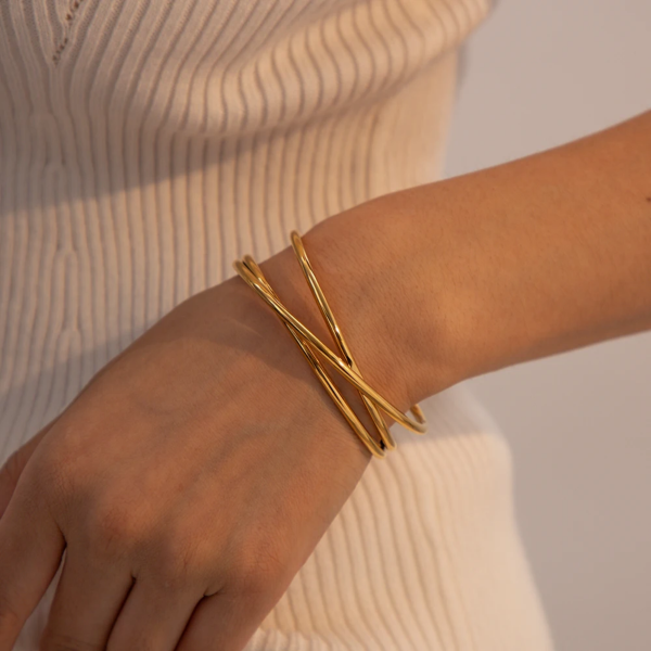 سوار بانگل مفتوح بتصميم ثلاث طبقات ،ستانلس ستيل مقاوم للخدش، طلاء ذهب 18ثابت، لايتأثر بالماء ولايسبب التحسس