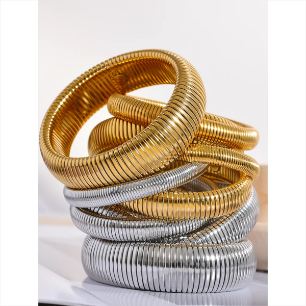 سوار بتصميم مرن متوسط السمك ،ستانلس ستيل مقاوم للخدش، طلاء ذهب 18ثابت، لايتأثر بالماء ولايسبب التحسس