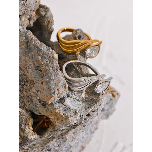 خاتم بتصميم ريشة مطعم بحجر الزاركون ،ستانلس ستيل مقاوم للخدش، طلاء ذهب 18ثابت، لايتأثر بالماء ولايسبب التحسس.