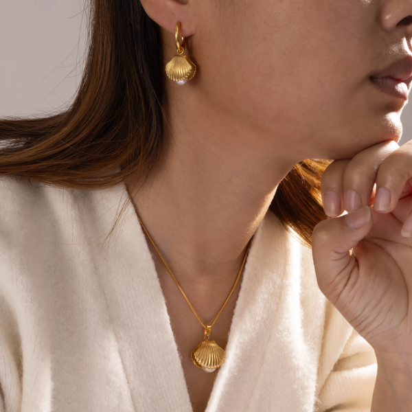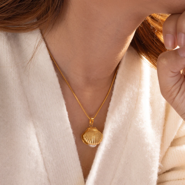 قلادة بتصميم صدفية داخلها لؤلؤة ،ستانلس ستيل مقاوم للخدش، طلاء ذهب 18ثابت، لايتأثر بالماء ولايسبب التحسس