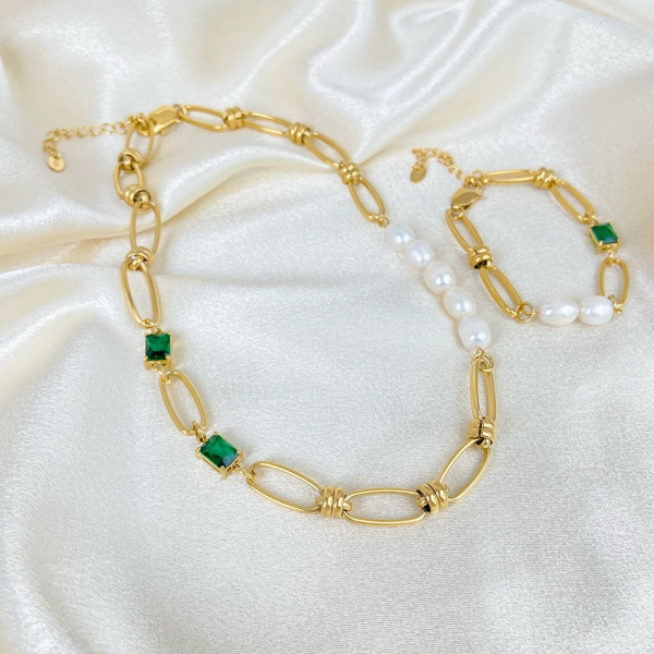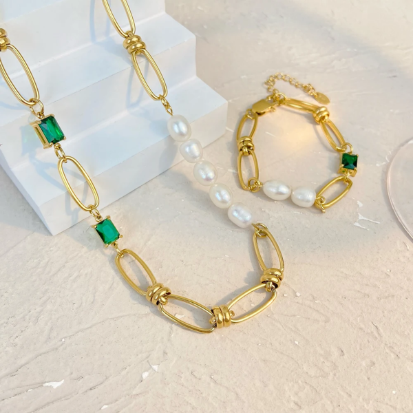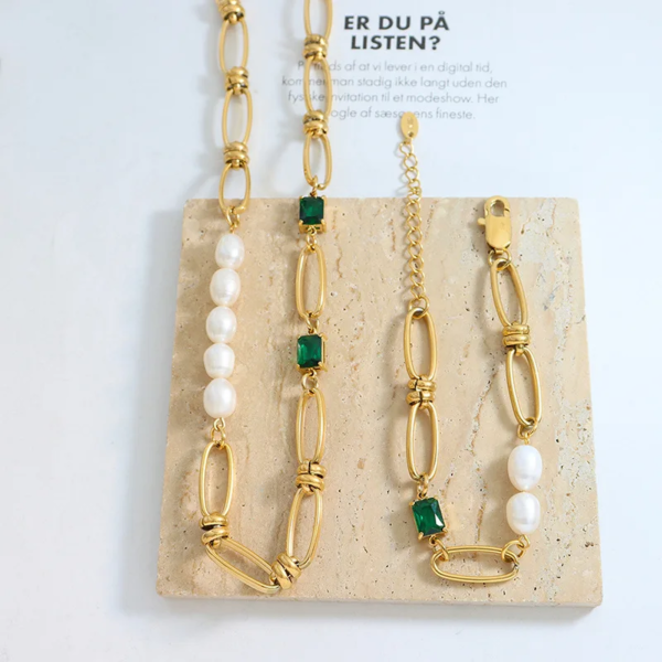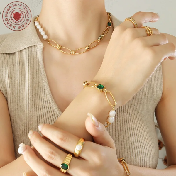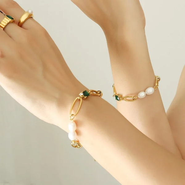 سوار بتصميم حلقات الدبوس مطعم بالزاركون واللؤلؤ الطبيعي،ستانلس ستيل مقاوم للخدش، طلاء ذهب 18ثابت، لايتأثر بالماء ولايسبب التحسس.