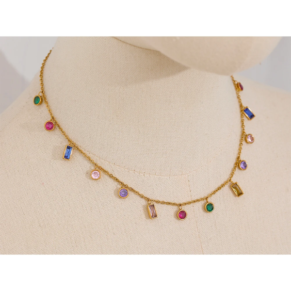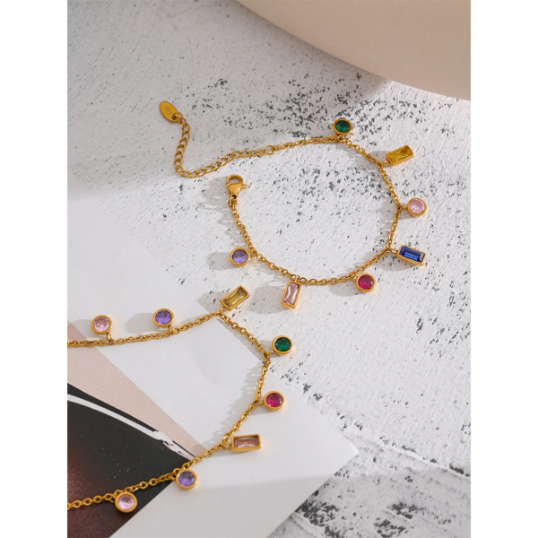 طقم قلادة وسوار مرصع بالزاركون الملون ،ستانلس ستيل مقاوم للخدش، طلاء ذهب 18ثابت، لايتأثر بالماء ولايسبب التحسس.