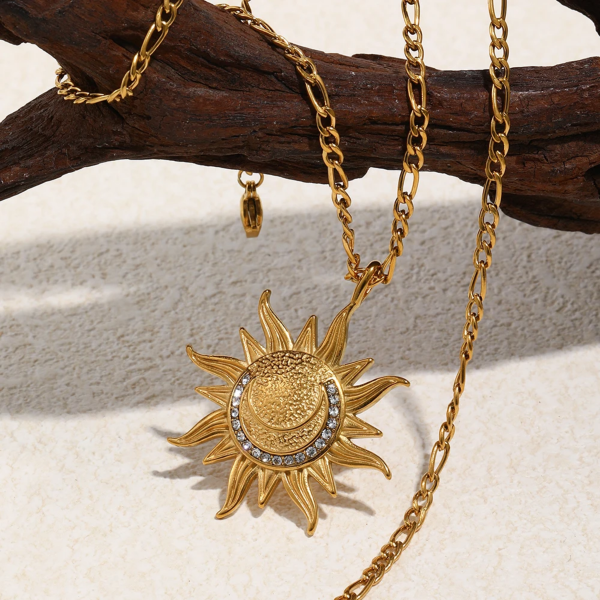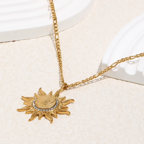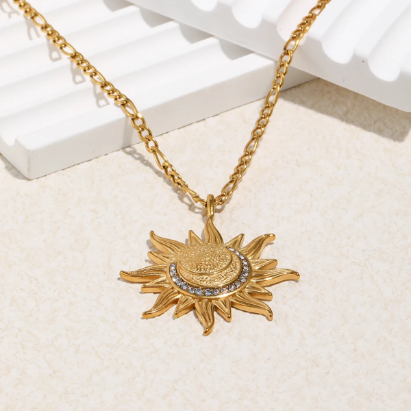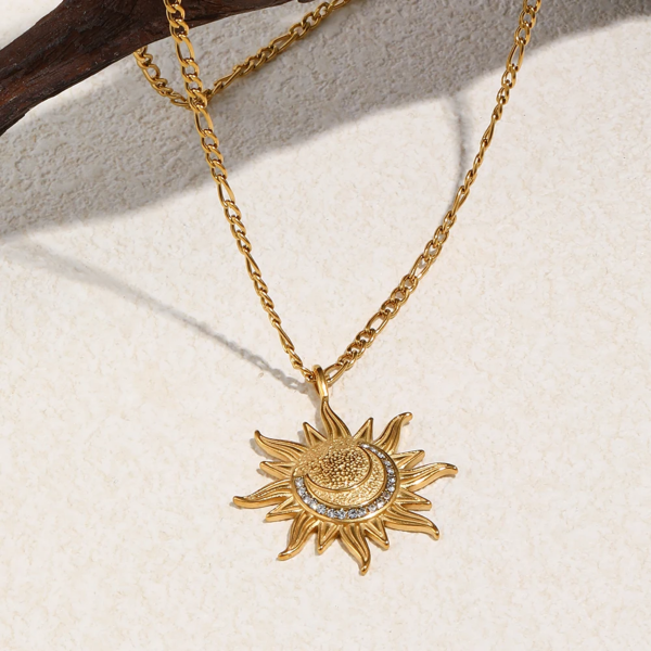قلادة بتصميم شمس مرصعة بالزاركون ،ستانلس ستيل مقاوم للخدش، طلاء ذهب 18ثابت، لايتأثر بالماء ولايسبب التحسس.