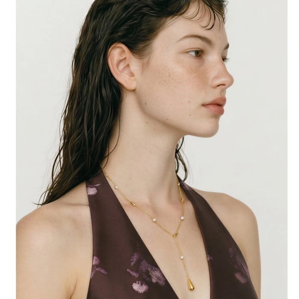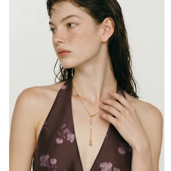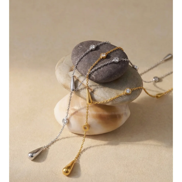 قلادة بتصميم سلسلة رفيعة بشكل دمعات وحبات الزاركون،ستانلس ستيل مقاوم للخدش، طلاء ذهب 18ثابت، لايتأثر بالماء ولايسبب التحسس