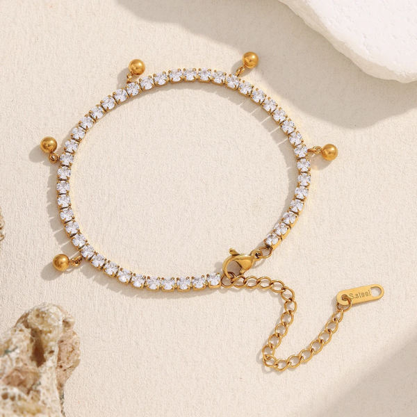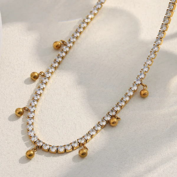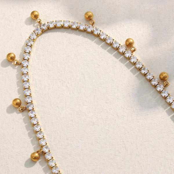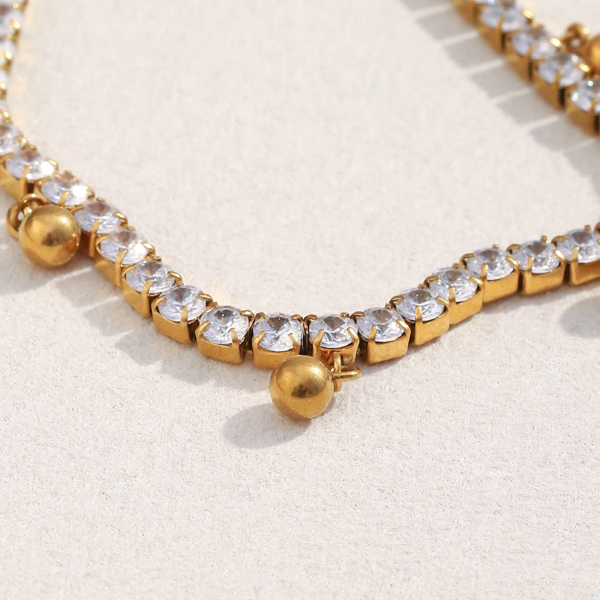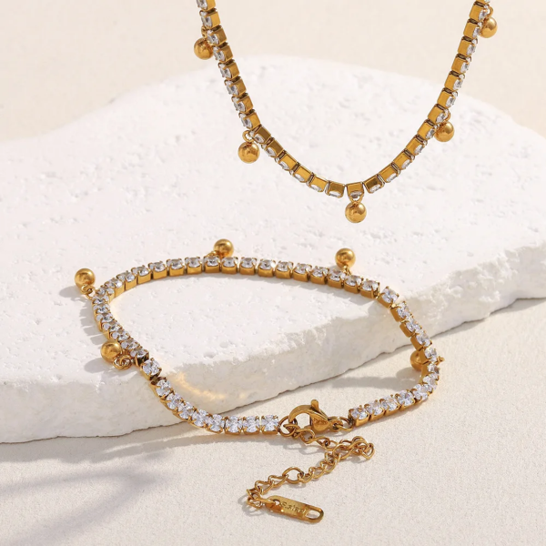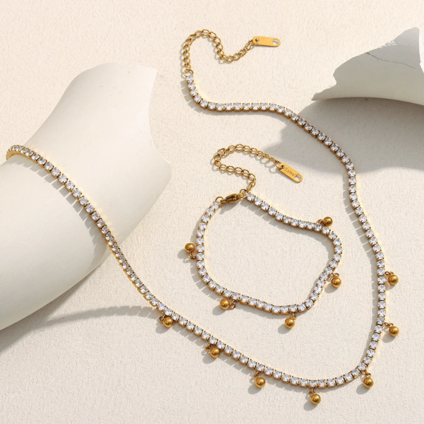 طقم قلادة وسوار زاركوني مطعم بكرات صغيرة ،ستانلس ستيل مقاوم للخدش، طلاء ذهب 18ثابت، لايتأثر بالماء ولايسبب التحسس