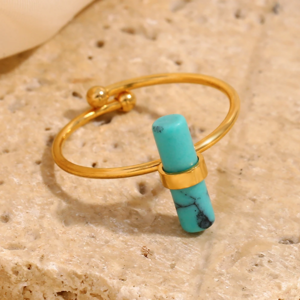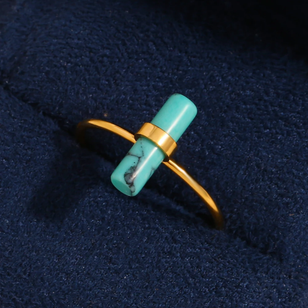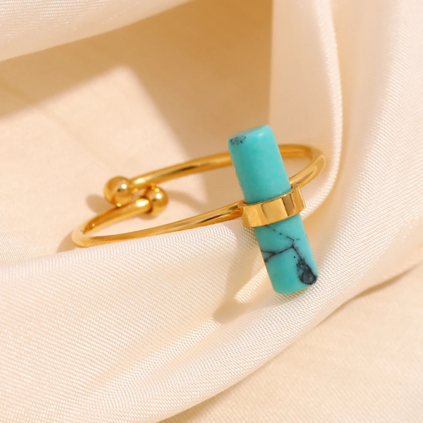 خاتم رفيع مطعم بالحجر الطبيعي الفيروزي ،ستانلس ستيل مقاوم للخدش، طلاء ذهب 18ثابت، لايتأثر بالماء ولايسبب التحسس