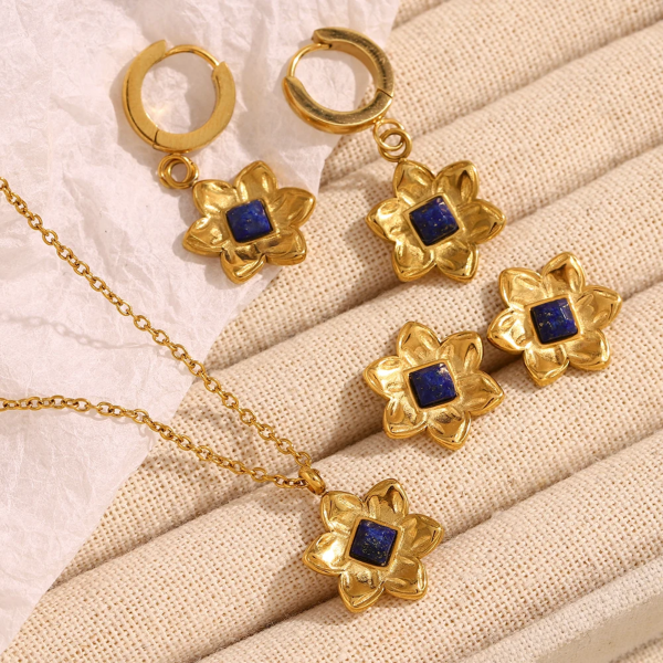قلادة بتصميم زهرة مطعمة بالحجر الطبيعي ستانلس ستيل مقاوم للخدش، طلاء ذهب 18ثابت، لايتأثر بالماء ولايسبب التحسس