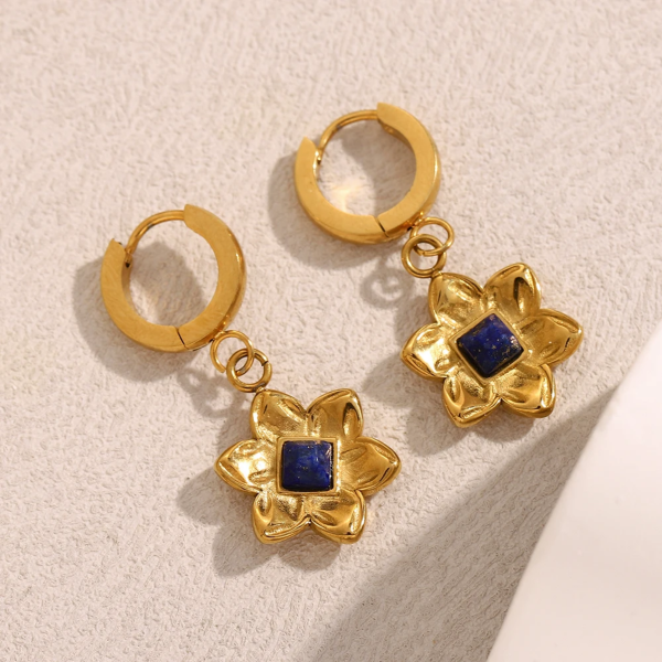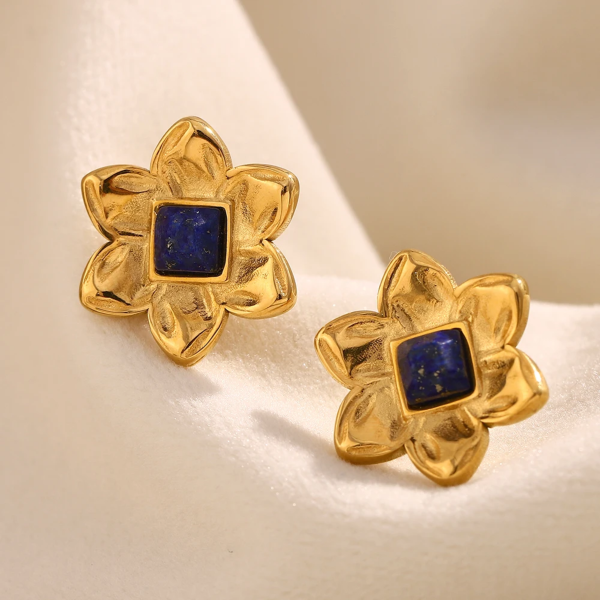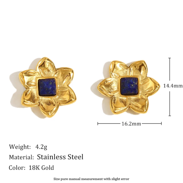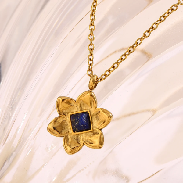 طقم قلادة وتراچي بتصميم زهرة مطعمة بالحجر الطبيعي ،ستانلس ستيل مقاوم للخدش، طلاء ذهب 18ثابت، لايتأثر بالماء ولايسبب التحسس