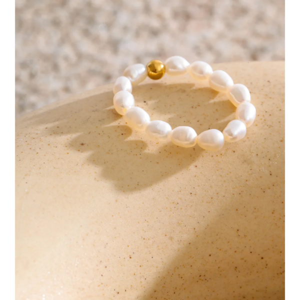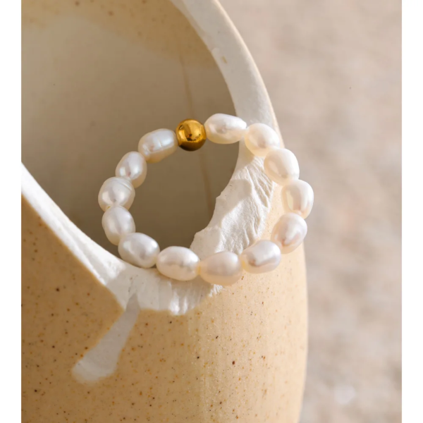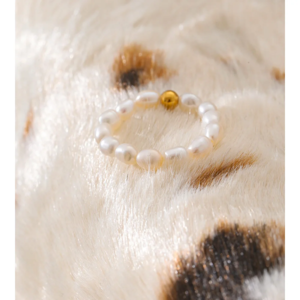 خاتم مرن من اللؤلؤ الصناعي ،ستانلس ستيل مقاوم للخدش، طلاء ذهب 18ثابت، لايتأثر بالماء ولايسبب التحسس