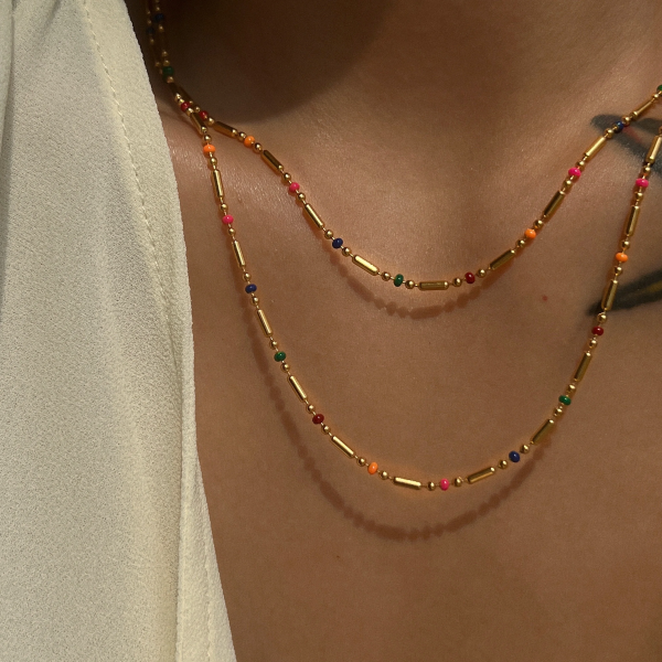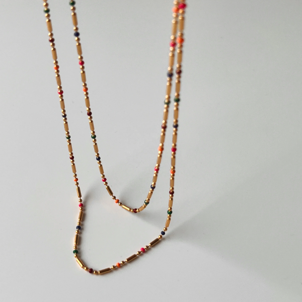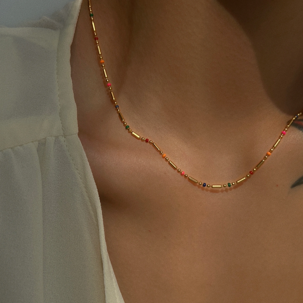 سلسلة رفيعة ملونة من الستانلس ستيل وطلاء ذهب 18k ثابت، لا يتأثر بالماء ولا يسبب التحسس.